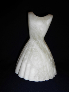 2014De bruidsjapon is gemaakt van een transparante albast voor een jubilaresse van een bruidshuis. Zij is geplaatst op een houten sokkeltje zodat de jurk iets van de grond afstaat.