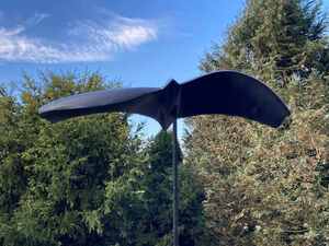Het is geplaatst op een hoge pin in een tuin zodat het boven de beplanting uitkomt.